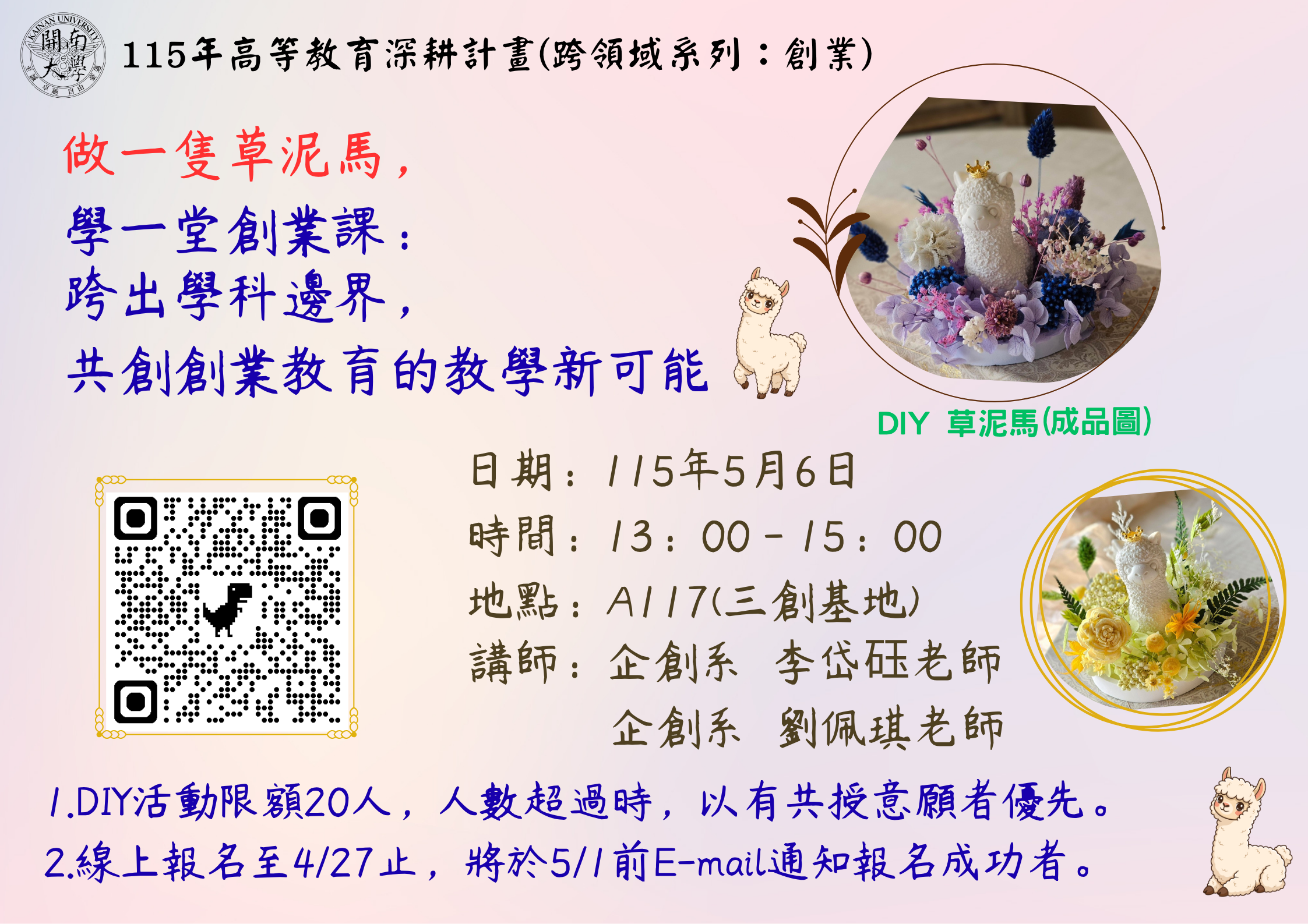 備註:1.本次跨領域研習(DIY草尼馬)名額限20人,人數超過時,將以有「跨領域共時授課」意願者優先。